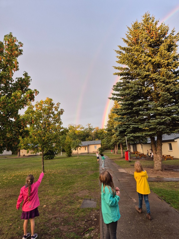 Am Donnerstag hatten wir verschiedene Aktivitäten auf der Feuerkuppe. Es gab den Lernort Natur dort lernten wir etwas über die Bäume und Tiere. Spannend war, dass uns ein Baum gezeigt wurde, auf dem ein weiterer Baum in einer Astgabelung wächst. Wir konnten auf einem Fahrrad mit 7 Personen über das Gelände gefahren. Anschließend gab es Mittagessen. Es war lecker. Nach einer kurzen Pause ging es weiter zum Schwarzlichttheater. Dort konnten wir selbst ein Theaterstück aufführen. Zum Schluss führte uns eine Schatzkarte wieder über das Gelände. Der Schatz war eine Kiste mit Süßigkeiten und Spielsachen. Am Abend haben wir gegrillt und viel gespielt. Gemeinsam sind wir um 20 Uhr zur Disco gegangen. Wir haben ordentlich getanzt und sind danach müde ins Bett gefallen. Am Freitag haben wir unsere Sachen gepackt und sind frühstücken gegangen. Um 10 Uhr sind wir in den Bus eingestiegen und waren um 11 Uhr wieder in der Schule. Dort warteten unsere Eltern schon auf uns.